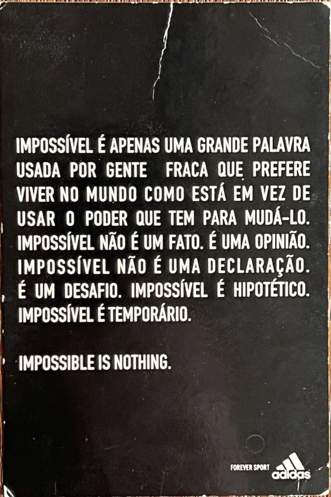 Em 2004, a Adidas lançou a campanha icônica “Impossible is Nothing”, que marcou gerações. O conceito é simples e poderoso: o impossível é um limite que muitas vezes criamos em nossa mente, e não uma verdade absoluta. #impossibleisnothing