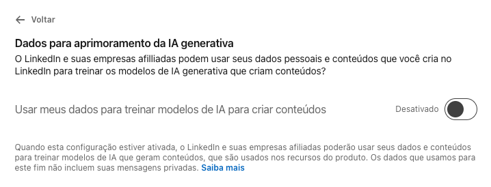 Para usuários do #LinkedIn, acesse suas configurações, vá ao menu Privacidade de dados, selecione a opção “Dados para aprimoramento da IA generativa”. Desligue essa opção. É inacreditável que isso seja ativado por padrão sem nenhuma notificação ao usuário.